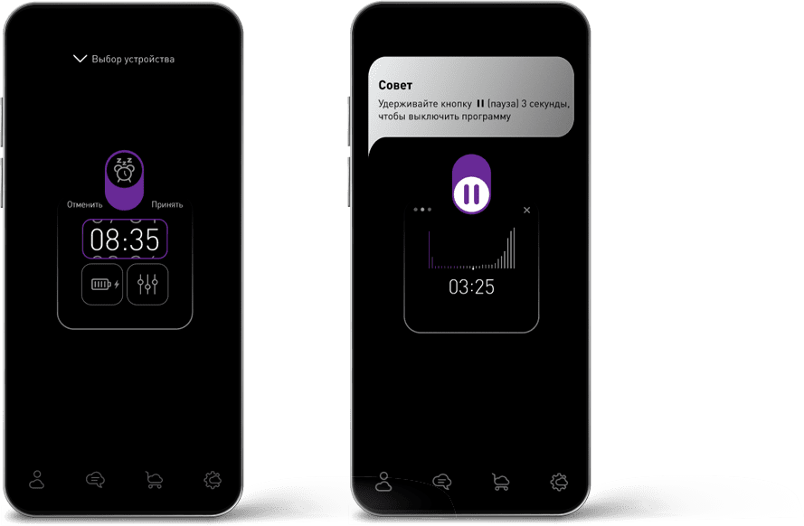 The sleep program is based on the patented algorithm of the changing frequencies of electromagnetic impulses during the night. It allows you to fall asleep faster, sleep deeper, wake up less often at night, and also feel cheerful in the morning when you get up.